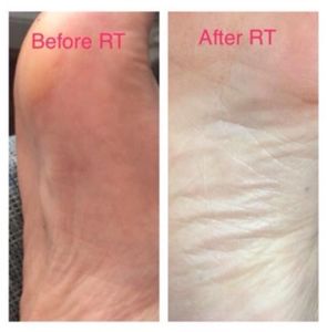 Low Dose radiation therapy is completely non-invasive. It's as simple as getting a x-ray. Your Radiation Oncologist (RO), will mark up your hands/feet (they call it mapping), the team that delivers your radiation will make a mold of your hand or foot, and when ready for treatment they will typically place the hand or foot into the mold and design a shield so that the RT will deliver in the exact spot needed, they will then typically apply a piece of bolus (sort of wet fabric) over the site. The will ask you to stay still and tell you when the RT begins and ends. It is typically under 1 minute. The standard treatment is 5 days, 3 grays a day and a waiting period of 8-12 weeks and then another 5 days, 3 grays a day. That's it!